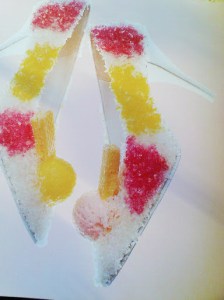 Der kleine Freak Tokio Kumagai schuf 1984 diese sehr extravagante Schuhmodelinie namens „Shoes to eat“, also „Schuhe zum Essen“. Er orientierte sich an Künstler wie Dalí und Pollock und stellte mit dieser Linie tragbare „Muster-Menü-Teller“.