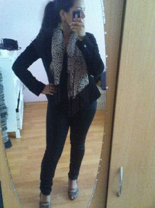 Das heutige Outfit!! schwarz mit Leomuster. Sowohl die Ohrringe als auch der Schal 🙂 sieht man auf dem foto nicht soo gut. scheiß kameraqualität.