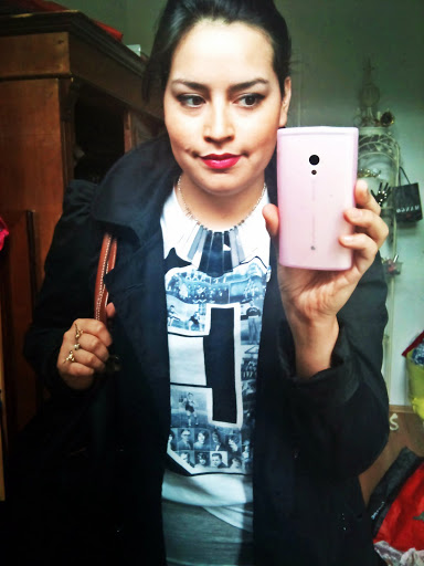 Hier seht ihr mein „C“ Shirt von NewYorker (Männerabteilung) und einen Jersey Minirock. Dazu der Trenchcoat von VeroModa, die Longchamp, in die wirklich Alles reinpasst, Kette aus Paris von NafNaf und der Vogelring von Topshop.