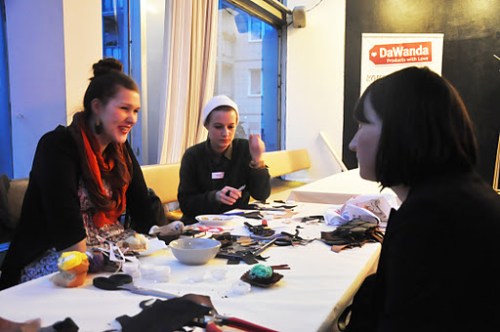Leider kam ich an dem Tag viel zu spät zum Fashionbloggercafes. Carina und Lois gingen als ich ankam, was ich total traurig finde und deshalb an dieser Stelle vorschlagen würde uns nächste Woche zu treffen! Dennoch blieb meine liebe Özi noch, um mir Gesellschaft zu leisten und umserer Kreativität, bei einem Happen von den leckeren Milka und Mango-Muffins, freien Lauf zu lassen. Es gab nämlich einen Basteltisch von Dawanda an dem man aus verschieden farbigen Lederstoffen Ohrringe machen konnte. Jeder der mich bei Twitter verfolgt, hat mein kreatives Chaos gesehen. Bei mir ging es total in die Hose. Es war anscheinend nicht so mein Tag. Aber bei Özi… Uhlala, die war nicht mehr zu stoppen. Vielen Dank an das Fashionbloggercafe-Team! Es hat wirklich Spaß gemacht. Mit Sue von Truly Madly Deeply fuhren wir schließlich zu dritt ins Alexa, um unsere Zeit vor dem nächsten Termin zu überbrücken.
