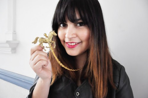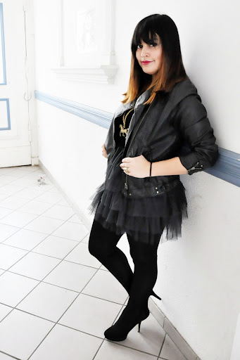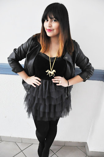 Hier trage ich eine Lederjacke von Pimkie, ein Kleid von H&M, die High Heels von Blanco aus meinem Spanientrip und meine selbstgemachte Pony Kette.