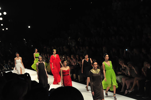 Für den Spring/Summer 2013 präsentierte uns Dimitri unglaublich schöne Kreationen. Zu dem Soundtrack aus dem Film „Wüstenblume“ bewegten sich die Models langsam und fließend über den Catwalk. Es wurde eine unglaublich schöne und gleichzeitig melancholische Atmosphäre durch die Klänge aufgebaut und schnell war ich von den Schnitten verzaubert. Die Farben waren kräftig und strahlten in den Farben rot, gelb und limettengrün. Besonders gut haben mir die eleganten Schnitte in Kombination mit Details im Ethno-Stil gefallen, wie z.B. die Kopfbedeckungen mit goldenen Perlen-Bestickungen und Federn. Das limettengrüne lange Kleid und der grüne Hosenanzug gehörten sofort zu meinen Favoriten. Es war eine wunderschöne Show!